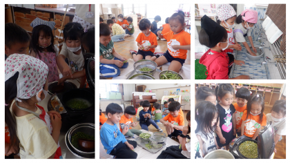 昨年の秋にまいた種がぐんぐん育ち、たくさんのウスイエンドウが収穫できました。年長組の子どもたちが、収穫した豆を使って、豆ごはんづくりをしました。