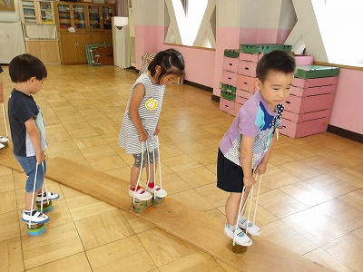 たんぽぽ組の子ども達は、先週おうちの人と一緒に作った竹ぽっくりを、朝いちばんに乗ることがブームです。