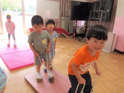 朝の用意を終えた子から、遊戯室やテラスを歩いたり、積木でつくった1本道に挑戦したりしています。