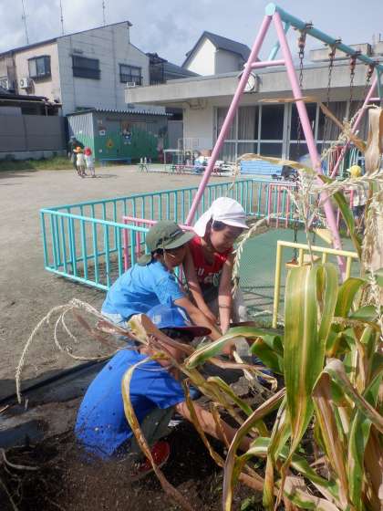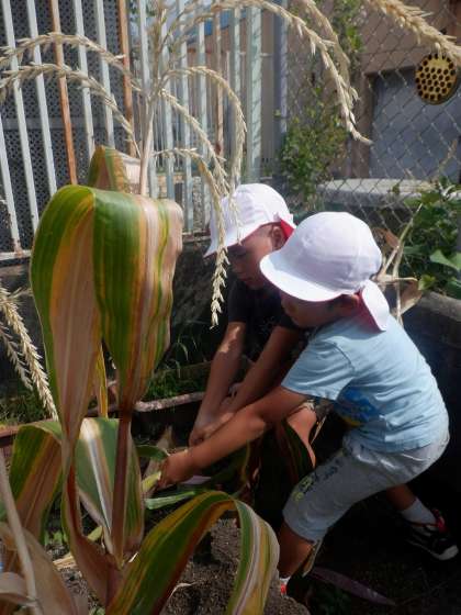 1学期に種から育てたポップコーンが、夏の間にぐんぐん伸びて、ポップコーンの実をつけました。今日は、収穫です。子どもたちの背よりも大きく伸びた苗を、力いっぱいに引っ張ります。一人ではなかなか抜けない時は、友達と一緒に力を合わせて抜きました。