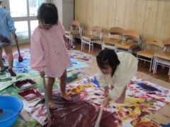 紙やバット、更には自分の体の上で混ざりあい変わっていく色を楽しむ様子もあれば、線や面でえがくことを楽しむ姿もありました。ここ!と決めた場所で何度も色を重ねたり、絵の具ののせ方や道具の使い方を試したりする姿もあり、それぞれに絵の具遊びを楽しんでいいました。