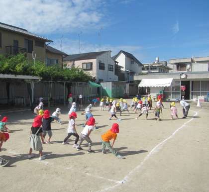 連日、朝の用意を済ませると園庭に出て体操やかけっこをして体を動かしています。