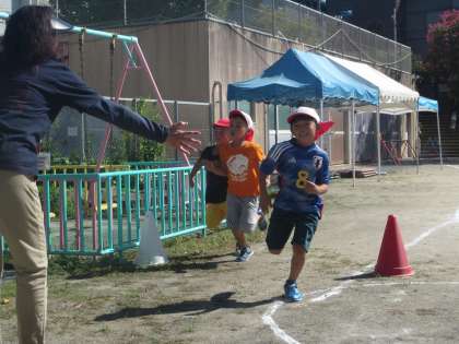 3歳は、クラスみんなで走ったり、先生に一人ずつ名前を呼ばれると嬉しそうに返事をして、ゴールで待つ先生のもとまで走っていきます。