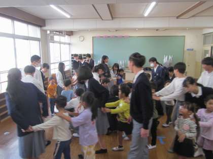 今日は4・5歳児が、中学校の家庭科の授業の一環として交流活動をしました。