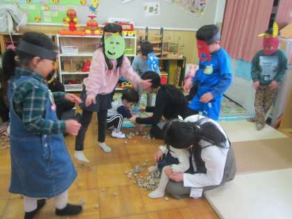 最後に、ゆり組のお兄さんやお姉さんが鬼の面をかぶって、こっこ組へ遊びに行き、びっくりするこっこ組でしたが、小さいお友達やお家の人が手作りの豆を投げたおかげで、ゆり組の子どもたちも優しいお兄さん、お姉さんに戻りました。