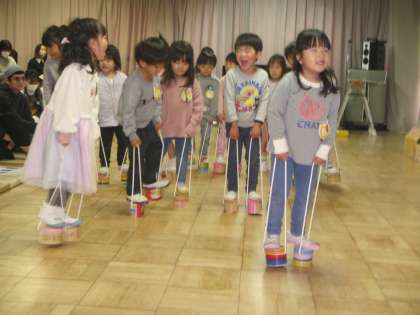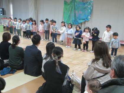今日は、たんぽぽ組の子どもたちにとって初めての生活発表会でした。お家の方に来てもらい、うれしい姿やびっくりして不安になる姿もありましたが、いつもどおりの元気いっぱいな表情が見られました。大好きな歌や手遊びを聞いてもらったり、体操や得意技を見てもらったりして拍手をたくさんもらいました。