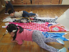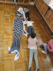 年長ゆり組が登園すると、保育室に大きなこいのぼりがいました。「どっちが大きいかな?」と先生が横に並んでみても、まだこいのぼりの方が大きい!自分たちも大きさ比べをしようと子どもたちも並んでみます。「いっしょくらい!」「まだ(こいのぼりの方が)大きい〜」と盛り上がりました。