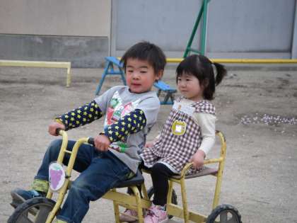 年中組や年長組のお兄さんお姉さんたちは年少組の友達にやさしく声を掛けてあげています。「ぼくが運転してあげようか?」「これ使う?」などなど・・・。やさしい気持ちがたくさんです。そんなやさしさに包まれて、おうちの人と離れて元気に遊ぶ年少組の友達の姿が増えてきました。