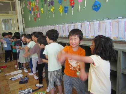 学校や、教室など、慣れない雰囲気にドキドキしている様子もありましたが、昨年度の年長児の姿を見つけたり、授業に出てくる踊りをゆり組の子どもたちも見ながら真似たりすることで表情もほぐれていきました。