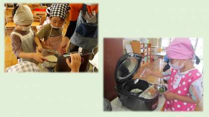 朝から「エプロン持ってきたよ!」と張りきっていて、順番を交代しながらお米を洗ったり、自分たちで収穫した豆を入れたりしました。