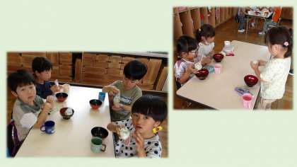 できあがった豆ごはんは、幼稚園きょうだいのさくら組と一緒に食べました。隣で「おいしい!」という声が聞こえて喜んでいました。