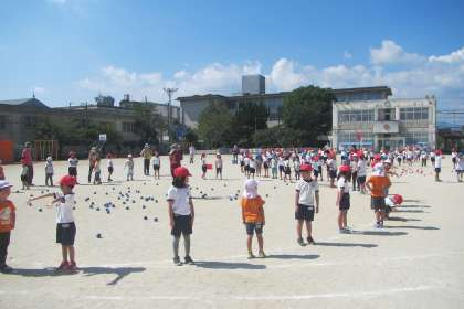 隣設する伏見板橋小学校の1年生と、みどり保育園・板橋保育園の年長組の子どもたちと一緒に小学校の校庭で玉入れをして遊びました。