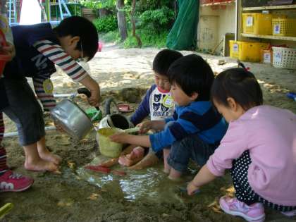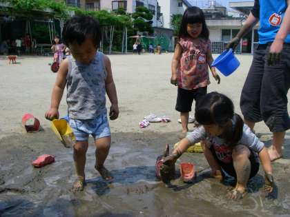 「きもちいいなぁ」と手や足でとろとろの感触を楽しみながら,砂遊びをしました。