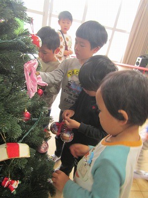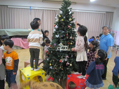 今日は幼稚園に大きなクリスマスツリーを出しました。飾りつけを一つずつ手に取り、「サンタさんや!」「キラキラきれい〜」と言いながら、飾っていきました。