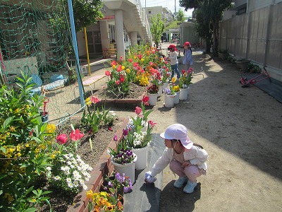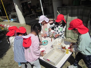 年長児が集まって色水遊びに取り組んでいると、「僕もやる!」と年中児も参加する姿が見られました。入園式を終えて初めての登園日となった年少児も、お兄さんお姉さんのやっていることに興味を持ってのぞきに来ていましたよ。