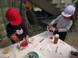 花びらを集めて水と一緒にすり鉢に入れてすりつぶすと、じわじわと色がにじみ出てきます。色が出てくる様子を楽しんだり、できた色水の色を見て楽しんだりと、草花を使っての色水遊びを楽しんでいました。