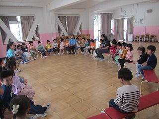 今日は年長ゆり組と年中さくら組の幼稚園きょうだいの初顔合わせをしました。年長児が自分のきょうだいに、自分と同じきょうだいマークをはってあげて、きょうだいを確認し合いました。