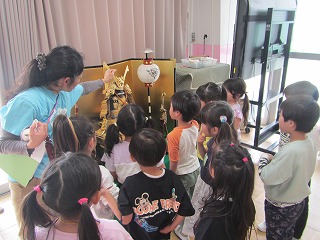 また、年長児は五月人形を飾りました。「忍者の宝箱じゃない?」と子どもたちが興味を持っていた重厚感のある箱に入っていたのは、兜や脛当といった鎧飾りでした。先生に飾りの名前や飾る意味等を教えてもらいながら、みんなで飾り付けました。