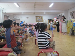 織姫や彦星といった七夕にまつわるお話を聞いたり“たなばたさま”の歌を歌ったりしました。また、サンサンママの方々が星のステッキをプレゼントしてくださり、それを使って七夕のクイズに参加しました。素敵な出し物と贈り物をありがとうございました!