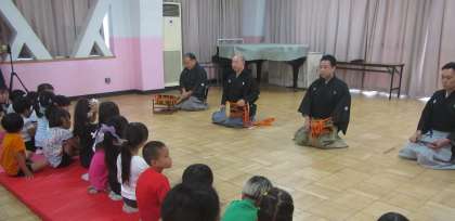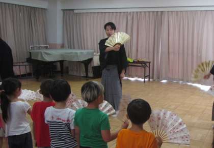 笛や打楽器などの音色に触れたり、扇子を持たせていただいたりなど