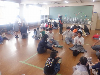 はじめはどきどきして体も表情も少しこわばっている様子がありましたが、いつも幼稚園で活動しているグループそれぞれに中学生の子どもたちがついてくれて、ゆっくり自己紹介をしあったりそれぞれが考えて用意してくれた遊びを楽しんだりする時間をつくってくれたので、だんだんと子どもたちの緊張もほぐれていきました。