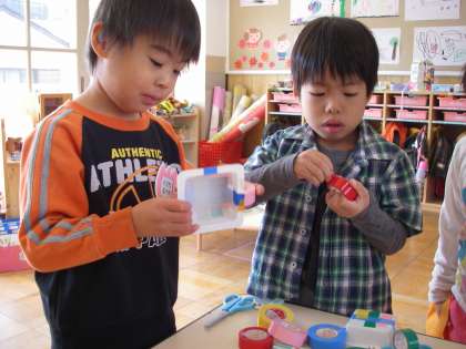 マジックやビニールテープできれいにしました。いろいろな色でぬり分けたり、ビニールテープも小さく切ったり、長く切ったりして個性豊かなおうちができました。