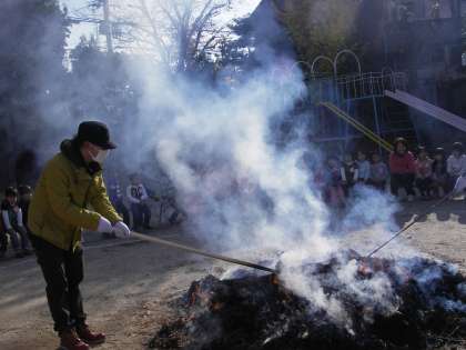 お母さんたちもわらをほぐしたり,おいもを配ったり,火の始末をした