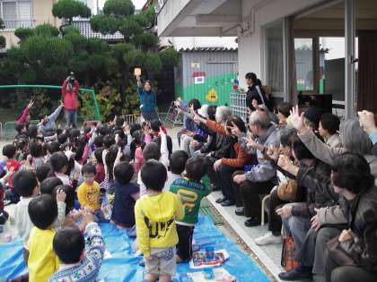 子どもたちと向かい合って,幼稚園の歌を聴いていただいたり手遊びを