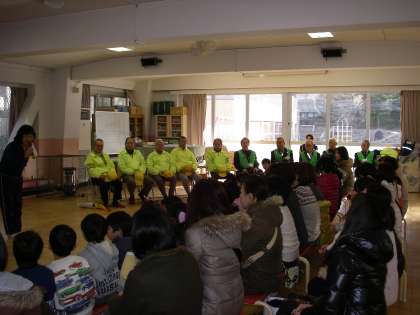 今日は,伏見警察署の婦人警察官の方や地域の交通安全活動推進委員協議会の方々に幼稚園に来ていただき,安全な道の歩き方について教えてもらいました。