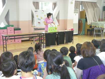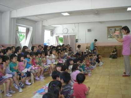 先生の話を聞いたり紙芝居を見て、虫歯のでき方、予防の仕方を教えてもらいました。みんな、一生懸命お話を聞いていました。