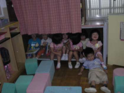 部屋で遊んでいたたんぽぽ組のみんなは,びっくりして