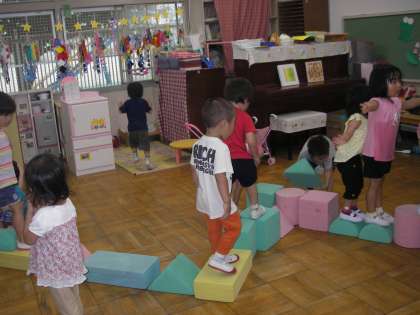 隅っこから出てきたみんなは,積み木の道を先生と作り出しました。