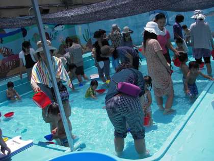 次に,プールで水遊びをしました。たくさんのお友だちと一緒で