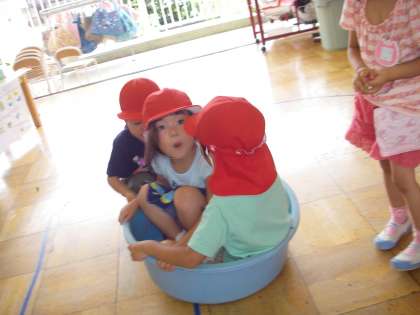 今日はたらいの下にアルミのおわんをくっつけた"UFO" に友達といっしょに入ってゆらゆら感を楽しんでいました。