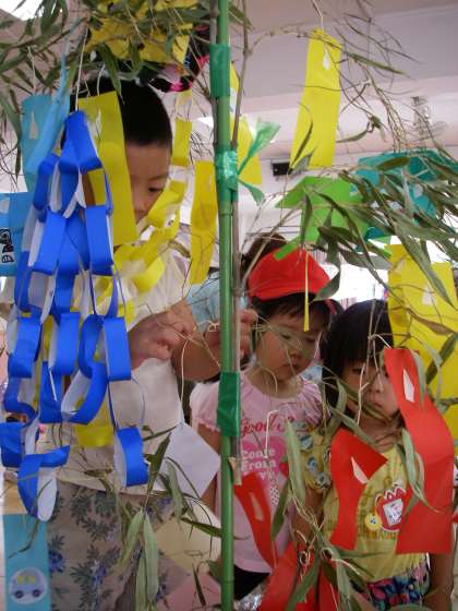 少し緊張気味の年中組。「一緒に飾ろう」という名目ではあったけれど,年少児に教えてあげる余裕はなく,でも後ろを振り返りながら,とっても気をつかい,自分のつくった飾りを笹につけていました。年長児の様子とは違うけれど,でもやっぱりお兄さん・お姉さんの姿でした。年少児から「ありがとう」とお礼を言われ,「いいえ,どういたしまして」と言う年中児はどこか誇らしげな顔でしたよ。