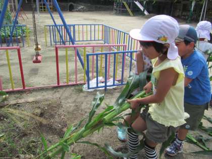 1学期に、種から植えたポップコーンを年長組が収穫しました。