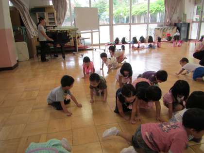 楽しみにしていた、お弁当と預かり保育が始まりました。今日の預かり保育は、子どもたちが大好きなリズム遊びです。ピアノのリズムに合わせて、動物になったり、ジャンプしたり、たくさん体を動かして遊びました。また、ゆり組とさくら組で一緒に遊ぼうね!