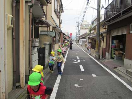 車道側を年長児が歩きます。年長同士で声を掛け合い,年少児を歩道側に入れる姿はとてもほほえましかったです。