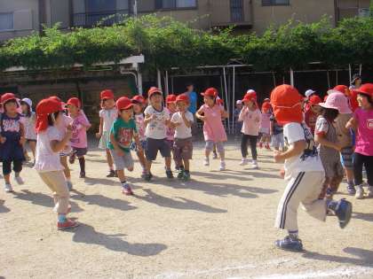 体操は「よーいどん」という体操です。走るのが大好きな子どもたち。大きな声で「よーいどん」と言いながら,体を動かしました。初めてする体操だったけれど,とても楽しそうでした。