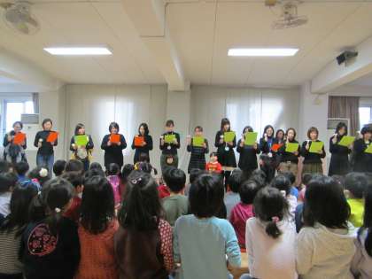 昨日の祭日は、伏見板橋幼稚園の119歳の誕生日。そこで今日、創立記念のつどいで、「幼稚園!119歳のおたんじょうび、おめでとう!」とお祝いしました。