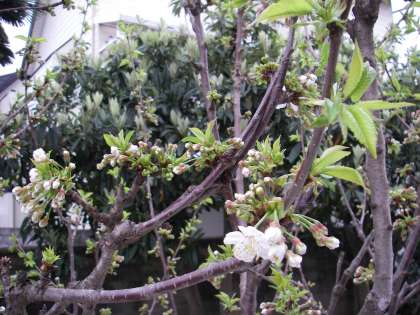 春休みもあと少しになり,暖かい日が増えてきましたね。子どもたちの声がしない幼稚園はちょっぴり寂しいですが,チューリップが蕾から花を開きはじめ,桜も満開できれいに咲いていて,幼稚園全体が春の雰囲気になってきました。サクランボの木にも花が咲きました。