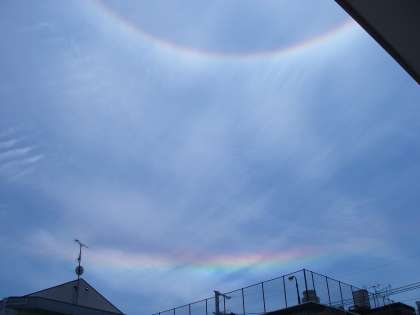 午後には、「あっ!虹が出てる」。見ると太陽のまわりに、まぁるい虹が出ていました。すると、“青い空のむこうには虹がかかったよ〜♪”といつの間にか声を合わせてうたい出す子どもたち。今日も幼稚園はにぎやかです。