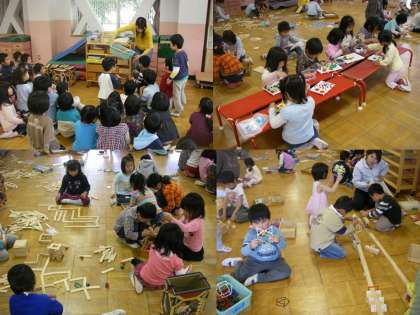 4歳児初めての預かり保育でした。いつもと違う初めてのカプラなどの遊具で、5歳児に使い方を教わりながらあそびました。