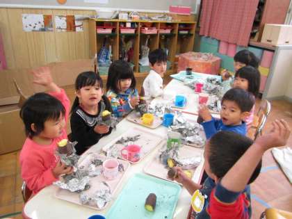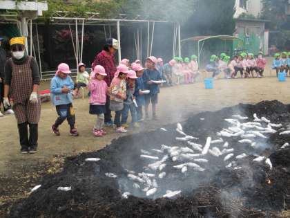 今日は、園庭でやきいも大会をしました。社会福祉協議会の方にお世話になり、地域のおじいさん、おばあさんにも来ていただきました。何日も前から、園庭の落ち葉を集め、やきいも大会を楽しみにしていた子どもたち。登園すると、たくさんのおいもを1つずつ、新聞紙とアルミホイルで包みました。PTAの役員さんやボランティアさんやサンサンパパの方々にも、朝から来ていただき、地域の方や保護者の方からいただいた、畳の切れ端や、木材、わらなどに火をつけて火床を準備していただきました。火床ができると子どもたちがおいもを入れ、その上から落ち葉をかぶせ、「早く食べたいなー」と待ちきれない様子。おいもができるまで、おじいさんやおばあさんたちと一緒に手遊びをしたり、子どもたちの歌を聴いてもらったりして、楽しい時間を過ごしました。おいもが焼けると、みんなでホカホカのおいもを食べました。「おいしいねー」とみんな大満足。貴重な体験ができて、子どもたちの心に残るやきいも大会になりました。ご協力してくださった皆様、本当にありがとうございました。