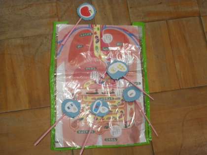 1つめは口から入ったりんごがうんちになって外へ排泄されるまでの道筋です。りんごが小さくなっていく様子や体のなかで電池(エネルギー)へと変わっていく様子を知って,その様子がとても不思議ですごいことだと思ったようでした。このことがきっかけで食べることへの興味関心が高まればいいなと思います。