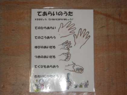2つめは汚れた手で食事をすると,その手についたバイキンがお腹のなかで悪さをすること,たとえばお腹が痛くなったり,水のようなうんちが出てしまうことを知りました。「お腹にバイキンを入れないためにどうすればいいかな?」の問いに,みんなは「きれいに手を洗えばいい!」と答えてくれました。お腹の風邪の予防に手洗いはとても有効です。これからもきれいに手を洗いましょうね。