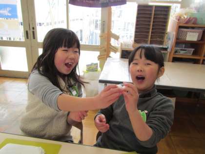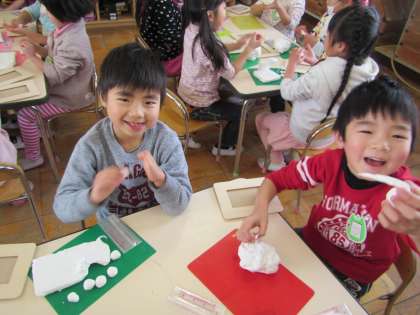 今日年長児は,修了記念作品づくりをしました。行事一つ一つ,日々の生活の中でもあと何回・・・と,卒園を意識するようになってきた子どもたち。今日は,最後の作品づくりとなりました。紙粘土をつかうことに大喜び。「見て見て!こんなになった!」二人の丸を合わせて「雪だるまー!」などと楽しみながら,フォトフレームに張り付けました。好きなハートや幼稚園の遊び場やお化けなどをつくっていました。個性豊かな作品が出来上がりそうです。