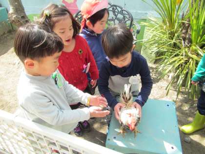 今日も当番の子どもが,年中組へのチャボ小屋の掃除の引き継ぎをしました。チャボを触ってみたいけどなかなかその一歩が踏み出せない年中児の様子を見て「抱っこしてみる?」と抱っこの仕方を教えてあげていました。年長児は,教えてあげることでいつもより張り切って掃除をしたり,年中児に優しく教えてあげたりする姿が見られます。年中児は憧れの年長児に教えてもらうことで,年長組への期待が膨らんでいます。