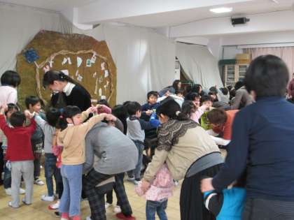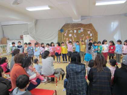 今日は,来年たんぽぽ組とちゅうりっぷ組になる子どもたちと保護者の方が来られました。年少組は,初めてお兄ちゃんお姉ちゃんとして発表するので,張り切ってうたったり手遊びしたりしました。年中組は,生活発表会でした劇遊びと楽器遊びを披露したあと,ロンドン橋がおちるで一緒に遊びました。年長組は,ハンドベルで♪星に願いを♪と,合奏で♪さんぽ♪を演奏しました。