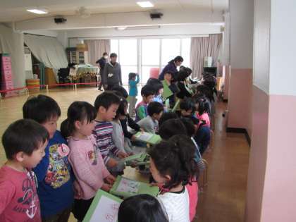 サンサンママによる劇やハンドベルの後は、みんなで歌をうたったり、仲良し遊び(♪誕生月なかま♪・♪ロンドン橋が落ちる♪)を楽しみました。幼稚園きょうだい(縦割りグループ)で一緒に手をつないで踊ったり、遊んだり・・・。この1年間で本当に仲良くなった幼稚園きょうだいの子どもたちです。年少児の子どもたちも、頼りにしている大好きなお兄ちゃんお姉ちゃんと遊ぶことがうれしくて仕方がない様子でした。互いに「一緒に遊んで楽しかったよ。ありがとう」とプレゼント交換もしました。幼稚園きょうだいに思いを寄せてつくったプレゼントでした。